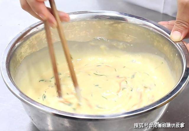10分钟后胡萝卜和南瓜丝也腌好了,把它们捞出来攥干水分,放入面糊里面拌匀,菜糊就调好了。