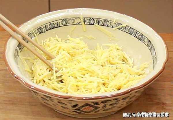 准备土豆两个,清洗干净,先切成薄片再切成细丝放入盆中,加入食盐2克,胡椒粉2克,搅拌均匀,再放入玉米面20克,面粉30克,使每一根土豆丝都均匀裹上面粉,以此来增加土豆丝的黏性,方便团成丸子。