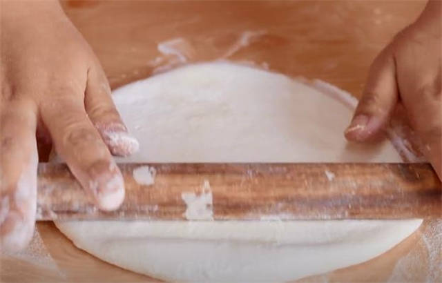 4.处理小面剂的时候,简单的揉匀揉圆就行了,接着用擀面杖我们擀成长方形的饼皮。