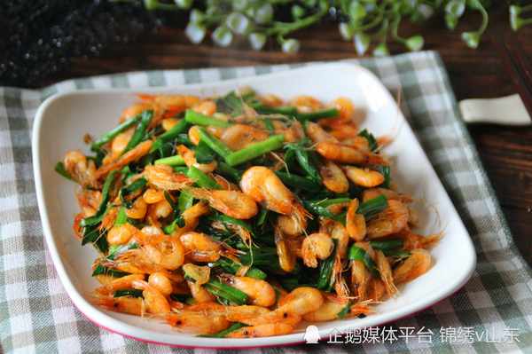5、紧接着倒入韭菜,快速翻炒六七秒钟,关火出锅。小河虾金黄酥脆,好吃补钙。