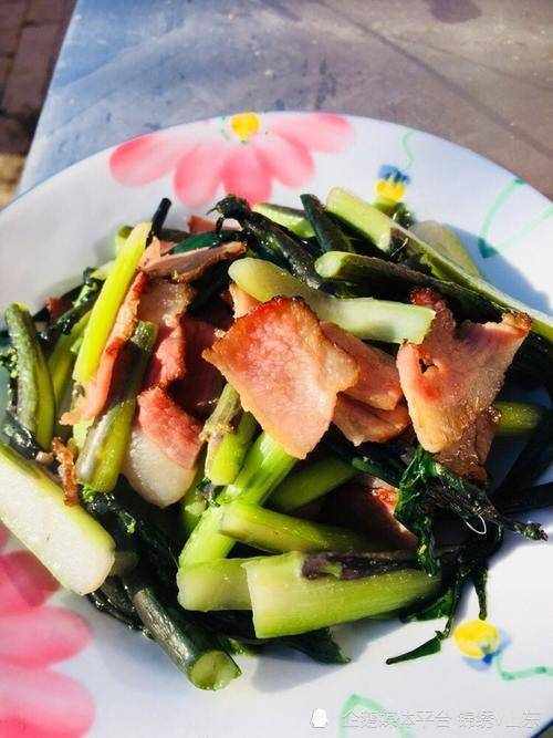 1、将菜薹撕去外边一层皮,并折成小段后淘洗干净