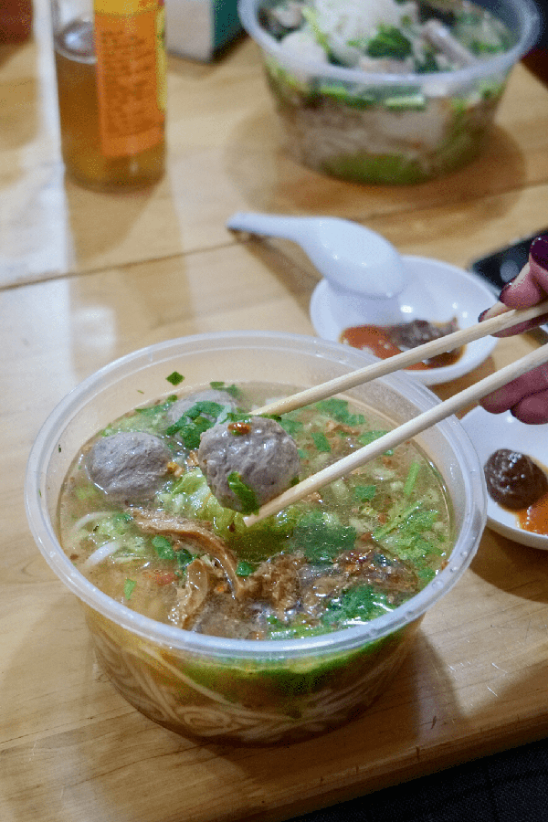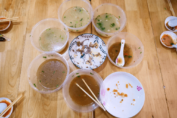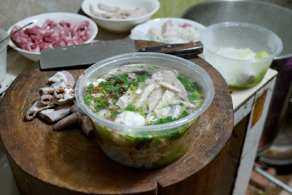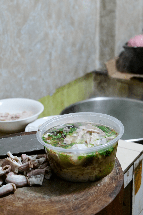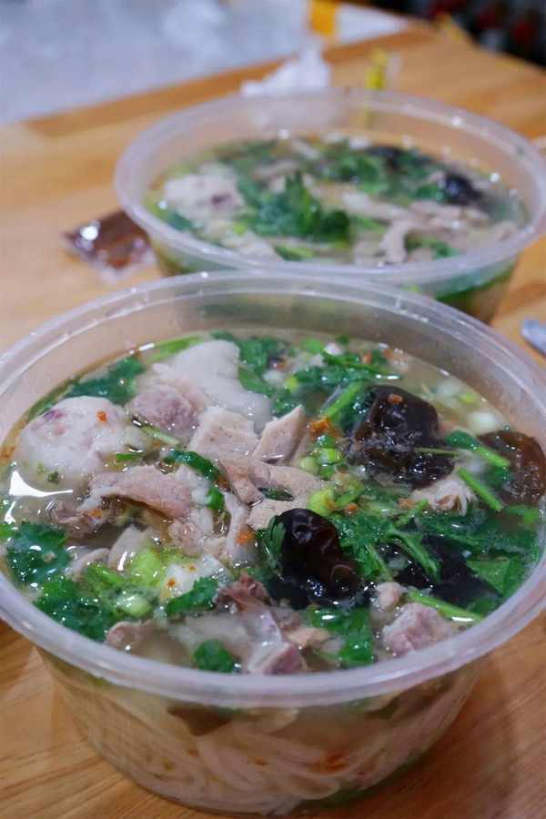 碍于食客的突然扎堆,一共有十来碗,备碗不够,我们的粿条装在一次性打包盒中。猪杂的和牛杂的,汤底各不相同。