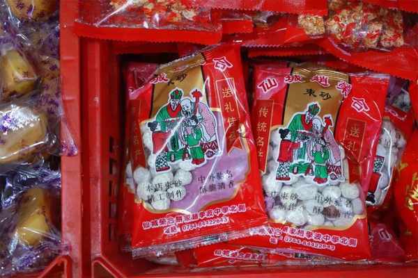 稍微得空的李哥,又从店里的货架抓出两包仙城束砂邀请我们品尝。束砂状如雪砂,是潮汕地区特色的传统小吃,类似于糖粘花生仁。
