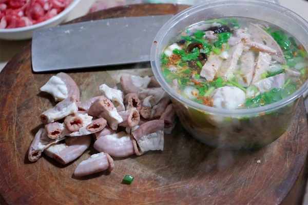 猪小肠在市场上踪迹难觅,每日得托卖猪肉的师傅从屠宰厂选货。杀出来,有苦味的,不能要。“粉子(潮汕人习惯叫猪小肠为粉子或粉肠)要香的才可以。”