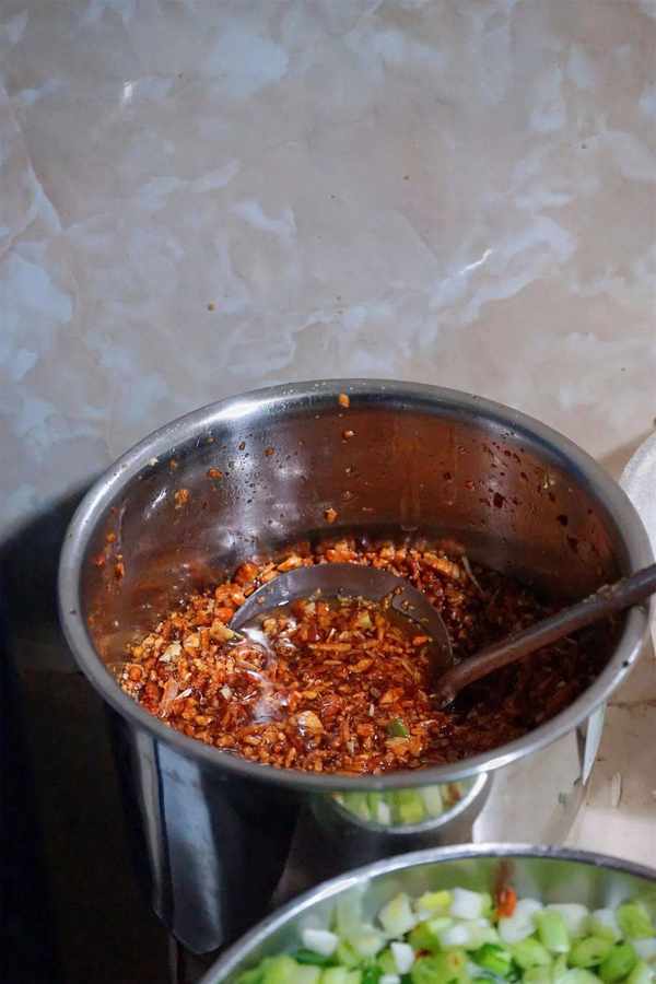 蒜末反复炸至金黄,火候掌控,稍微的不稳定,都可能造成炸黑炸失败。也有成品售卖,“但没有自家炸的味道香浓。”