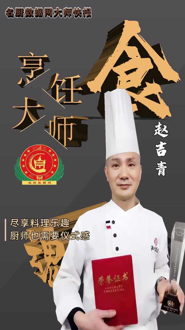 赵吉青大师属于低调沉稳型的厨师,十多岁进入餐饮行业,凭借自己踏实肯干,好学的精神很快得到师父的赏识,在平时的工作中不怎么爱说话,一心求艺,就是这样的精神为自己厨艺发展之路奠定了一定的基础。