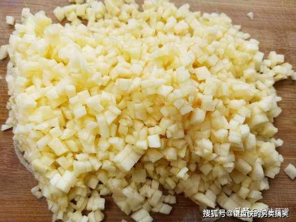 2、苹果削去外皮,先切成厚片,在切成细丝,最后切成小碎丁。