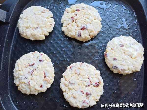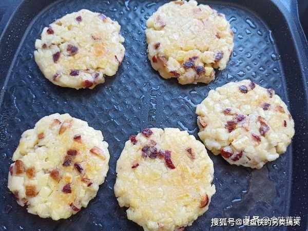 7、用手按成小饼,用电饼铛或者不粘锅,预热1分钟,刷一层食用油,放入苹果糯米饼,开中小火先烙2分钟。