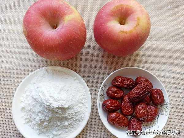 1、准备两个新鲜的苹果,适量糯米粉、大红枣,苹果的营养丰富,容易消化吸收。