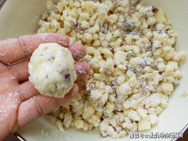 6、搅拌到最后,苹果和糯米粉可粘连在一起,用手团成圆形,手抹点食用油,可防止粘连。