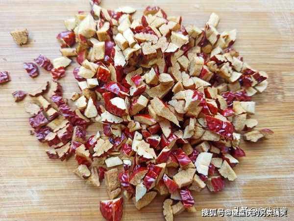 3、大红枣泡水,清洗干净,一切两半,挖去中间的枣核,切成小碎丁。