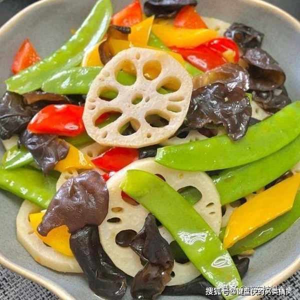 准备食材:莲藕,木耳,荷兰豆,彩椒,蒜末,食盐,白糖,白胡椒粉。