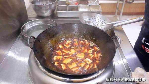 7.然后沿锅边淋入适量的清水,加入胡椒粉2克、鸡精3克、白糖少许提鲜,搅拌化开调料,汤汁烧开以后再熬3分钟充分熬出酱料的香味。接着把豆腐放入锅中煮一下,让豆腐吸收汤汁入味,煮熟以后捞出来放入盘中垫底。