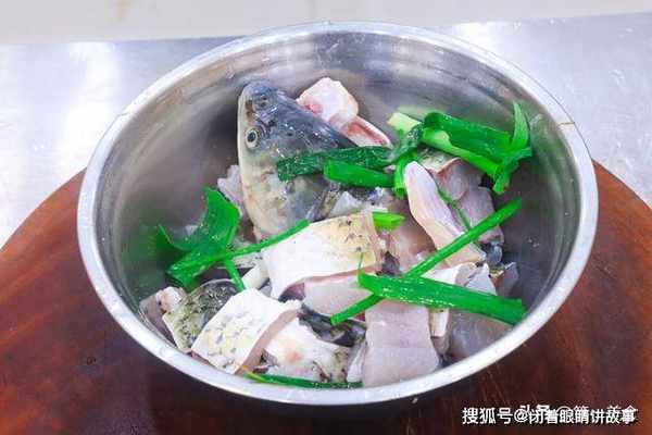 2.把鱼头剁下来一分为二,沿着脊骨片下两边的鱼肉,把鱼骨和鱼肉分别切成小块,再次用清水抓洗干净,沥干水分腌一下。