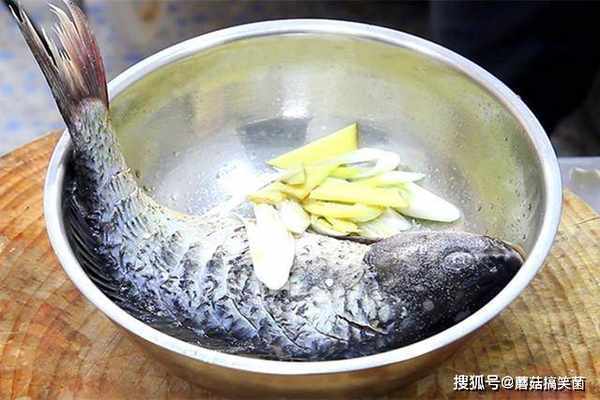 处理干净的鲤鱼一条,擦干鱼身的水分,用手压紧鱼身,每相隔2厘米划一刀,划至鱼骨、不要划透;大葱白斜切成马蹄片,生姜切成薄片鲤鱼放一起,倒入适量的料酒去腥,加入食盐三克,胡椒粉两克,把调料均匀地涂抹在鱼身上,然后腌制10分钟。