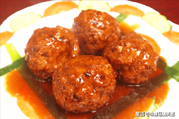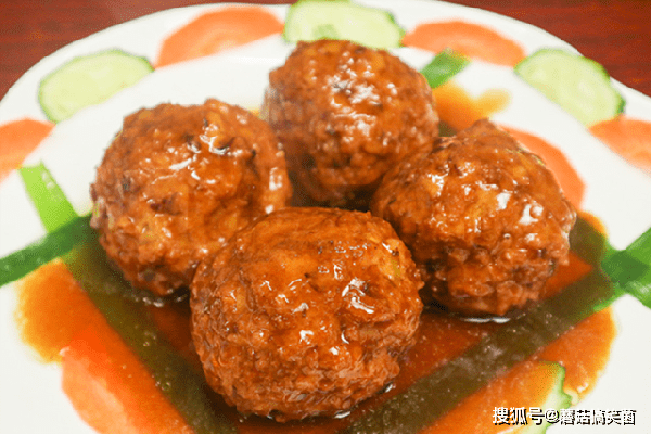15分钟以后把丸子盛放在盘中,锅里的汤汁加入水淀粉收浓,淋点明油提亮,然后起锅浇在丸子上面、美味即成。