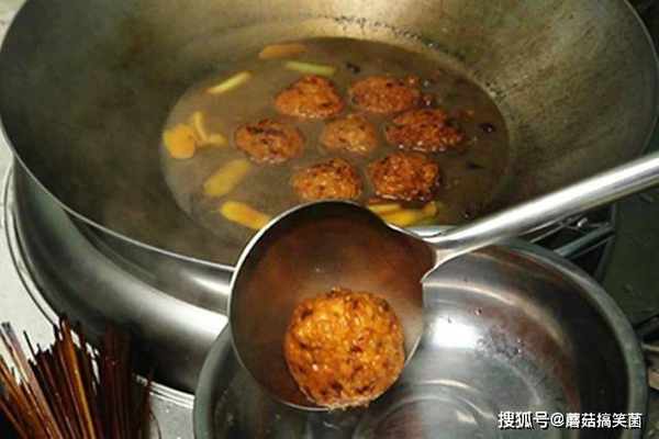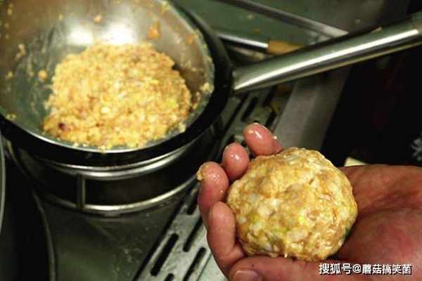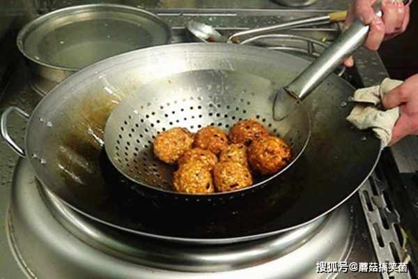 锅内多烧一些油,抓一把馅料团成丸子,油温六成热时把丸子轻轻地放入锅中,高油温快速把丸子炸定型,然后转小火浸炸3分钟左右,丸子炸至金黄、表皮酥香即可捞出。