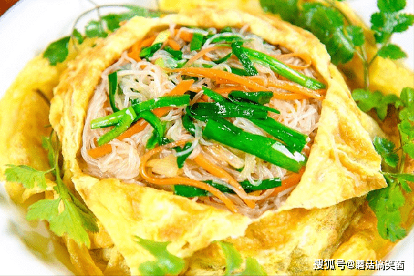 锅内再烧油,倒入葱姜红干椒爆香,放入焯过水的蔬菜丝和粉丝翻炒几,然后加入生抽,食盐,鸡粉,胡椒粉调味,翻炒至香味融合后出锅,倒在蛋皮上面,再倒扣在盘子里。