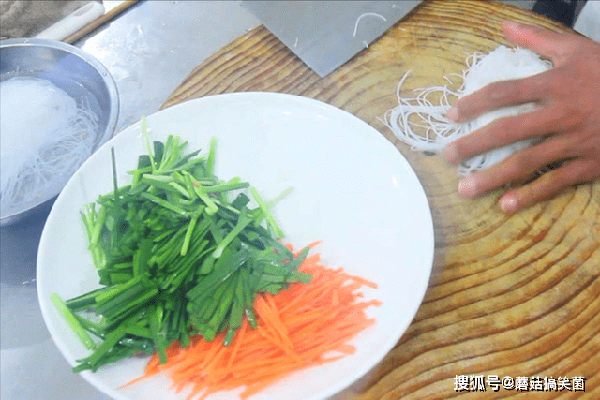 胡萝卜半根,切成细丝。韭菜一把,洗净、切段;粉丝提前泡软,从中间切上一刀;葱白斜切成圈,生姜切菱形片,再加入几粒干辣椒;碗中打入两个鸡蛋,加入少许水淀粉增加韧性,搅拌打散成蛋液备用。