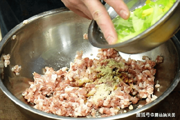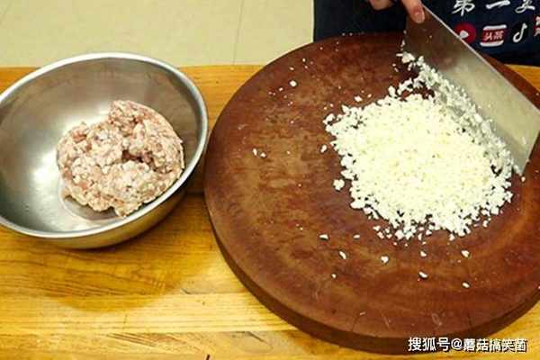 三分、七分瘦的五花肉馅500克放入盆中;去皮马蹄300克,剁成小颗粒和肉馅放一起。