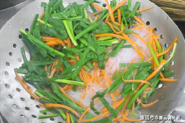 锅内加水,大火烧开以后先放胡萝卜焯水20秒,再放入韭菜和粉丝,快速翻一下立即倒出,用凉水冲洗过凉,以免粉丝坨在一起。