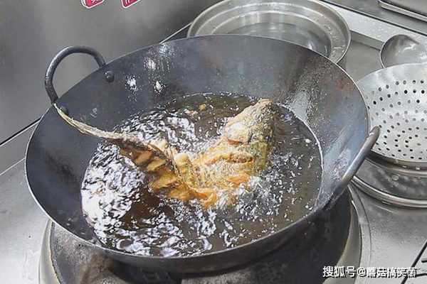 锅内烧油,油温升至5成热时取出鲤鱼,抠着鱼头和鱼尾,把鱼身先放入油锅炸定型,这样方便炸出翘头翘尾的造型。然后把整个鱼放入锅中,开中小火炸五分钟到六分钟,把鱼炸至金黄酥脆,用筷子能轻松扎透,即可出锅控油。