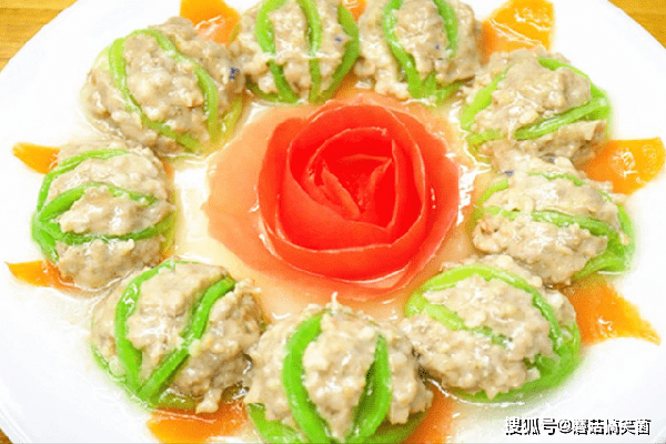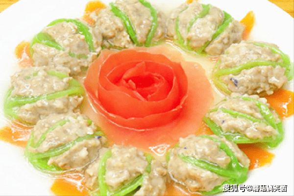 15分钟以后把萝卜酿肉取出来,放上番茄雕花,浇上薄芡汁,就能上桌享用了。