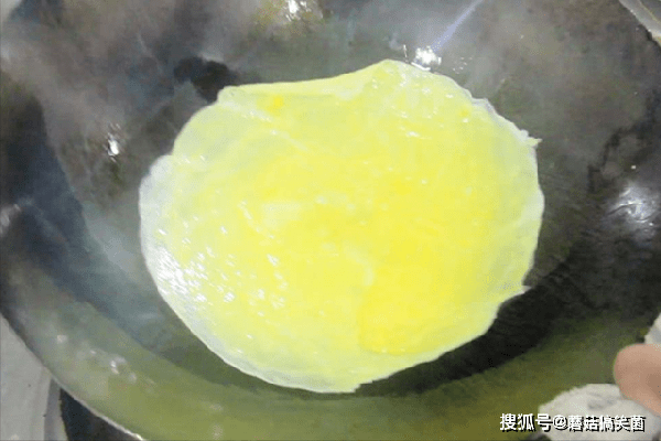 锅里烧油,倒入鸡蛋液,转动锅摊成圆形的蛋饼,小火煎至边缘定型以后淋点植物油翻过来,把两面都煎至定型,倒出来放入碗中。