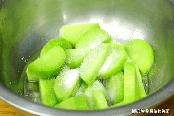 两个新鲜的青萝卜,把外皮削干净、对半切开,然后每4刀切断一次、切成连刀片,切好以后撒上食盐拌匀腌制10分钟,去除辛辣味同时把萝卜腌软。