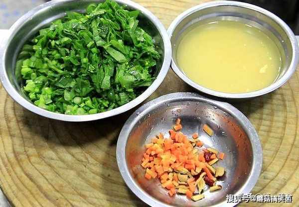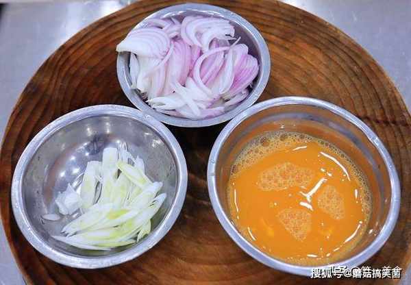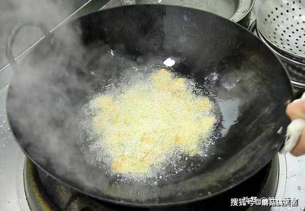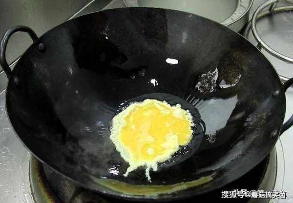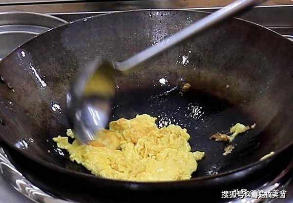 锅内烧油,充分滑锅以后倒出热油加入凉油,把蛋液倒入锅中轻轻地推散,翻炒几下,鸡蛋炒熟以后用勺子打散,倒出来备用。