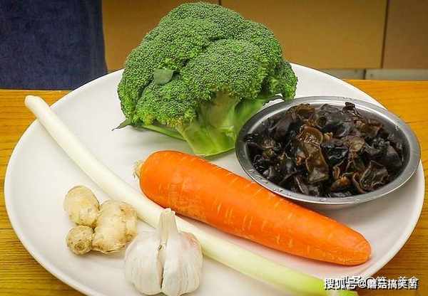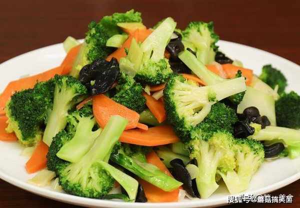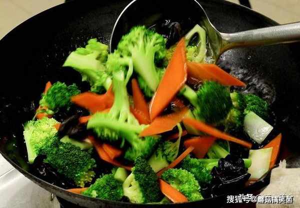 锅内烧水,淋入植物油锁住营养,加入两勺食盐增加底味,水烧开以后放入胡萝卜、木耳、西兰花稍微烫一下,西兰花返青以后倒出来,用清水冲洗过凉,保持清脆的口感。