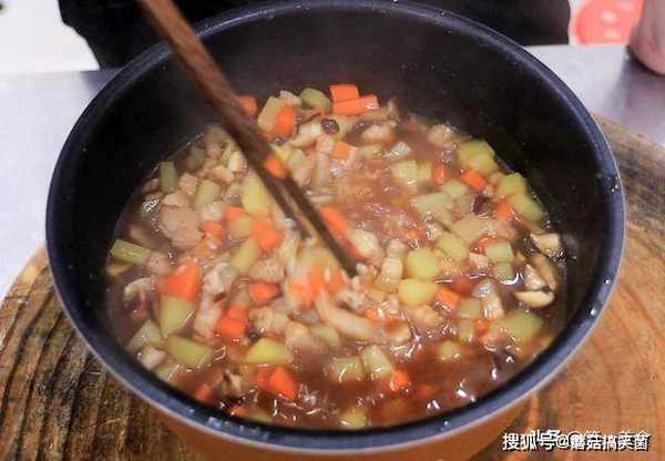把食材连同汤汁一起倒入电饭锅中,菜汤的量以没过大米1厘米为宜,太多的话蒸出来的米饭发黏、不劲道,把大米蒸熟。