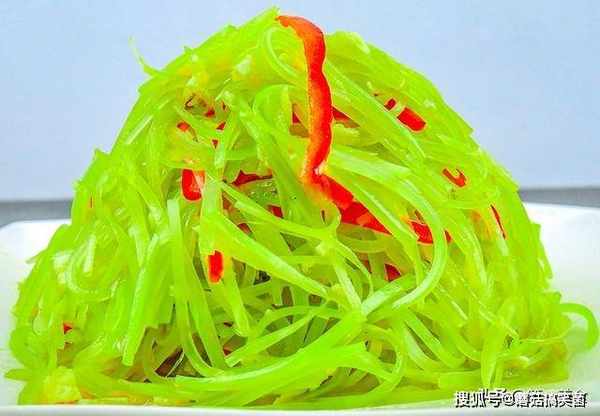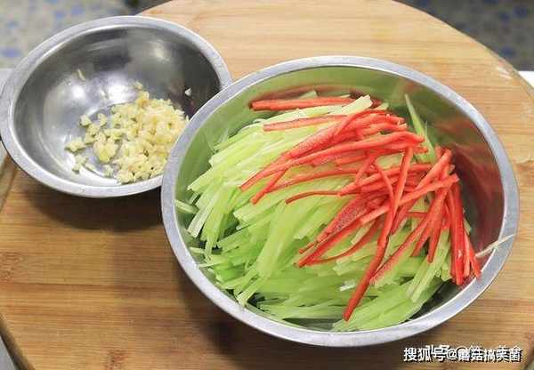 准备莴笋一根,把外皮去除干净,把根部切除,切成大小相同的长段,先把莴笋切成薄片,再改刀切成细丝。