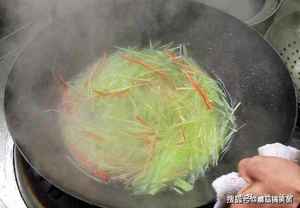 锅内烧水,放入植物油,植物油遇热会吸附在莴笋上,与水隔离阻止营养流失,为菜品增色增亮,水烧开后倒入莴笋丝、辣椒丝焯水20秒钟,捞出莴笋,用凉开水冲洗迅速降温,吃起来会更加的清脆爽口,焯水的时间,一定不要超过20秒钟。