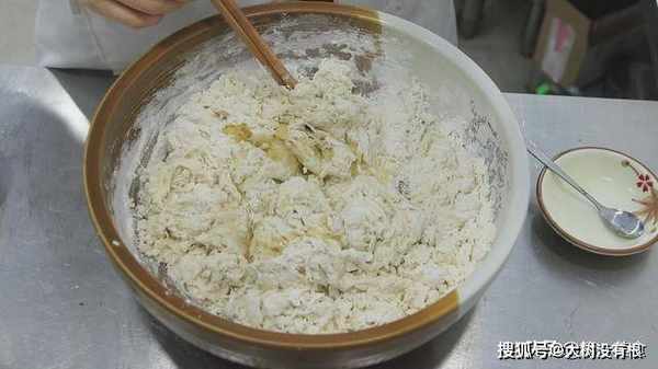 再用热水化开5克白糖, 也倒在面粉中,倒入温水, 用筷子搅拌成面絮,搅拌到面盆中没有干面粉 。