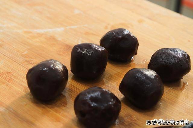 这个时候我们取点红豆沙 ,搓揉成圆球,揉红豆沙的时候手上最好粘一点油,红豆沙不会太粘手。