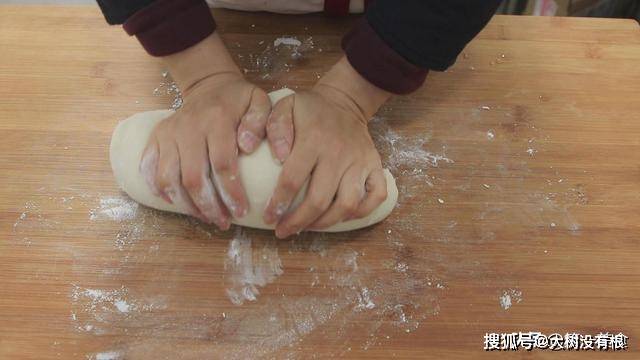 在案板上面撒上一点干面粉,把面团取出,放在案板上面搓揉,压实面团里面的小孔 。