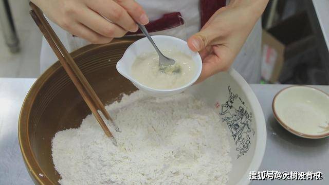 首先,普通面粉200克,倒入酵母3克 ,用温水化开后倒在面粉中。