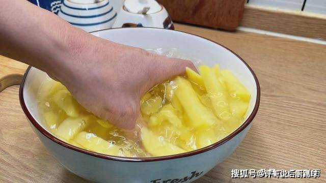 2、然后加入少许白醋,加入没过土豆的清水,加入白醋,防止土豆氧化变黑。泡上大约5分钟,然后用手抓洗几遍,洗去多余的淀粉,捞出控干水分。