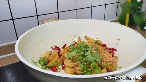 8、然后加入土豆条快速的翻炒一下,让土豆充分吸收花椒辣椒的味道,这里可以把火调成中火炒,然后加入食用盐,千万别要放的多了,接着加入少许的生抽,一大把的香菜翻炒一下,把香菜的味道炒出来。翻炒的时间不用太长,大约翻炒上一分钟,然后就可以出锅了,装入盘中,这个时候浓浓的香辣味已经散发出来了。