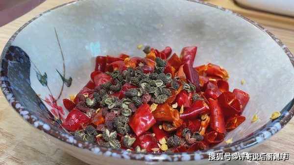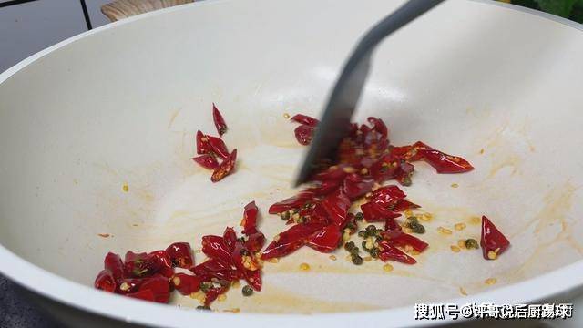 7、起锅烧油,下入之前准备好的辣椒、花椒,用铲子小火煸炒一下,这里一定要用小火,大火容易把食材炒熟,小火才能炒出食材的香味。