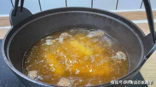 5、起锅烧油,油温5成热,下入裹好淀粉的土豆,这里的土豆要逐个一个一个的下入,避免粘连在一起,刚下锅的土豆不要马上搅动,那样会脱粉。