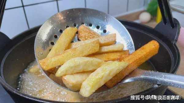 6、等土豆上的淀粉定型后,用罩篱轻轻的搅动一下,就算有粘连在一起的,轻轻的一敲就开了,然后接着中火慢炸,大日炸上3~4分钟,炸到土豆颜色金黄,外表焦的像这个样子就可以就可以捞出来了。喜欢吃特别焦脆的可以复炸一遍,然后放入滤网中控油备用。