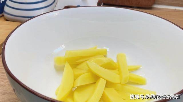 1、我们准备几个小一点的黄心土豆,黄心土豆经过烹饪后内心比较的香糯,比较适合做咱们今天的这道菜。首先我们用刮皮刀把土豆的外皮去掉,然后把土豆切成厚一点的片,厚度大约一厘米,太厚太薄都会影响口感,然后把土豆片切成条,宽度大概也是一厘米左右,右切好之后放入到大碗中。