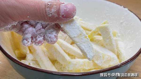 3、加入一勺食用盐入个底味,用手抓一下,让盐充分被土豆吸收,然后加入适量的玉米淀粉,没有玉米淀粉的,也可以用别的淀粉代替,用手给它抓一下,抓拌均匀,这时候土豆挂的粉不是很足,需要进行二次挂粉,然后再加入适量的玉米淀粉,再次给它抓拌均匀,让土豆的每一个面上都裹上淀粉,这样土豆吃起来才会更加的脆口,像这个样子就可以了。