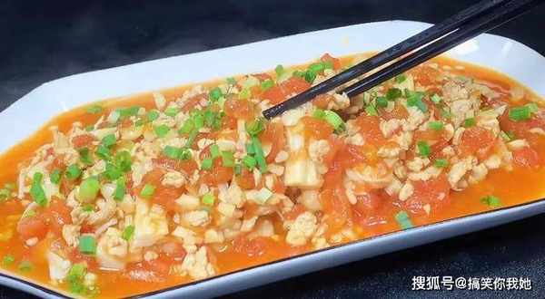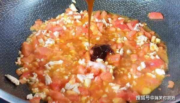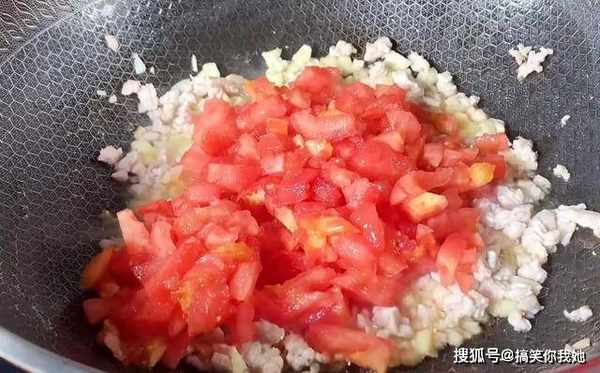7、继续倒入切碎的番茄,炒匀。