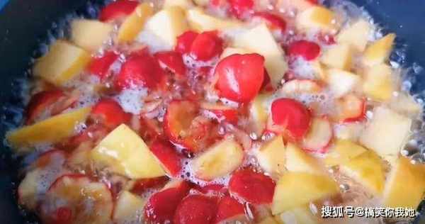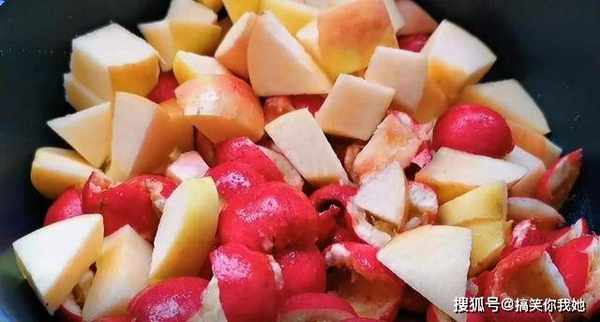 2、接着切碎一个苹果,也放在锅中。