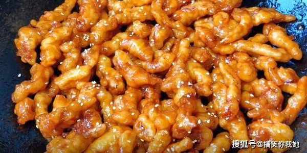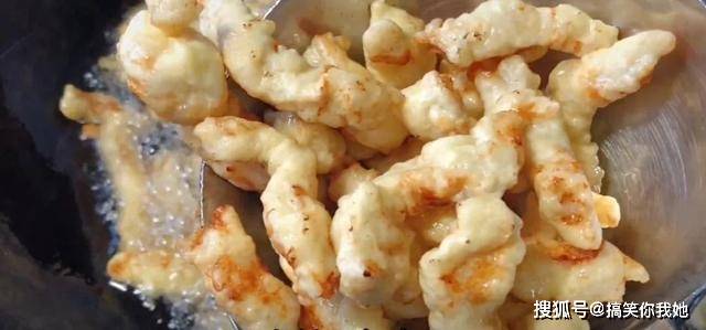 4、热油至6成热,倒入里脊肉,油炸至金黄爽脆。捞起备用。