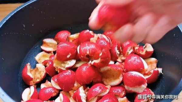 1、先将山楂去核,切碎放锅中。