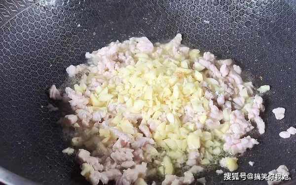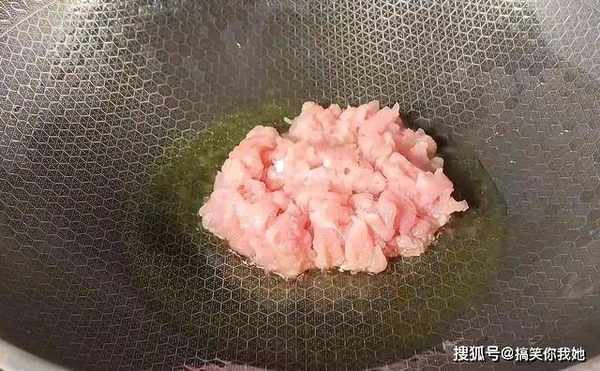 5、接着热油,倒入切碎的猪肉。
